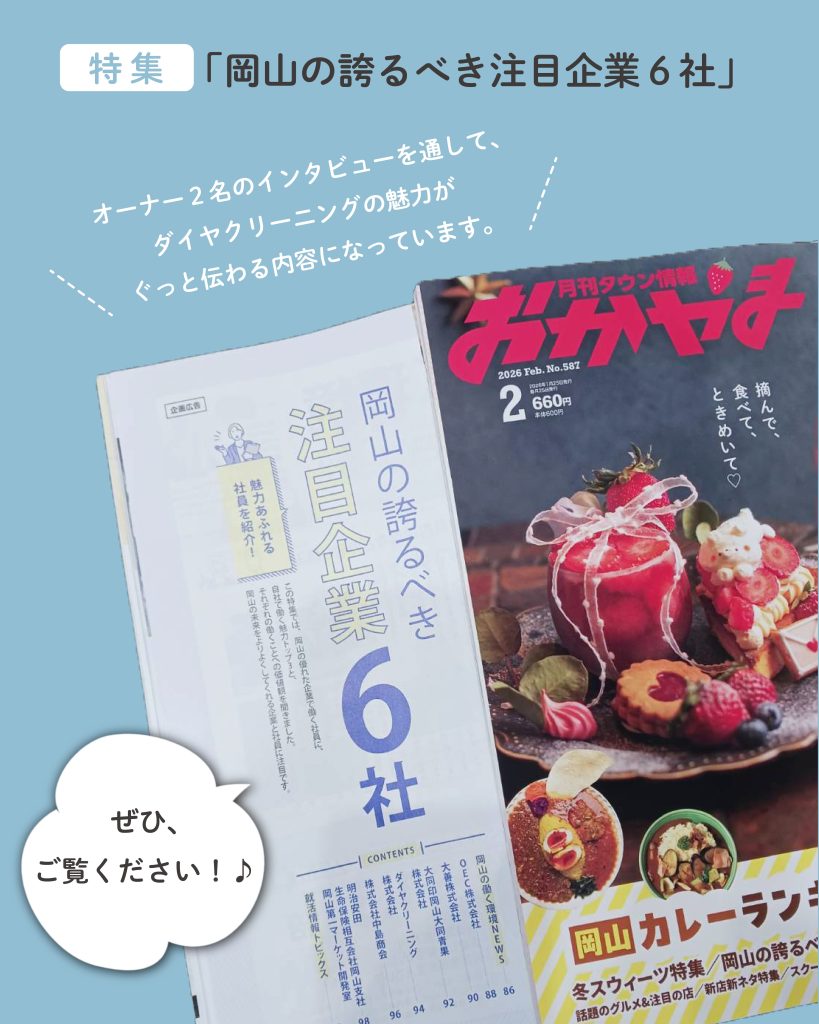 このたび タウン情報おかやま 2月号の「岡山の誇るべき注目企業6社」特集に、ダイヤクリーニングを掲載していただきました!