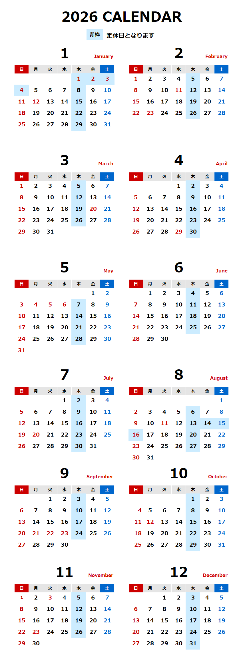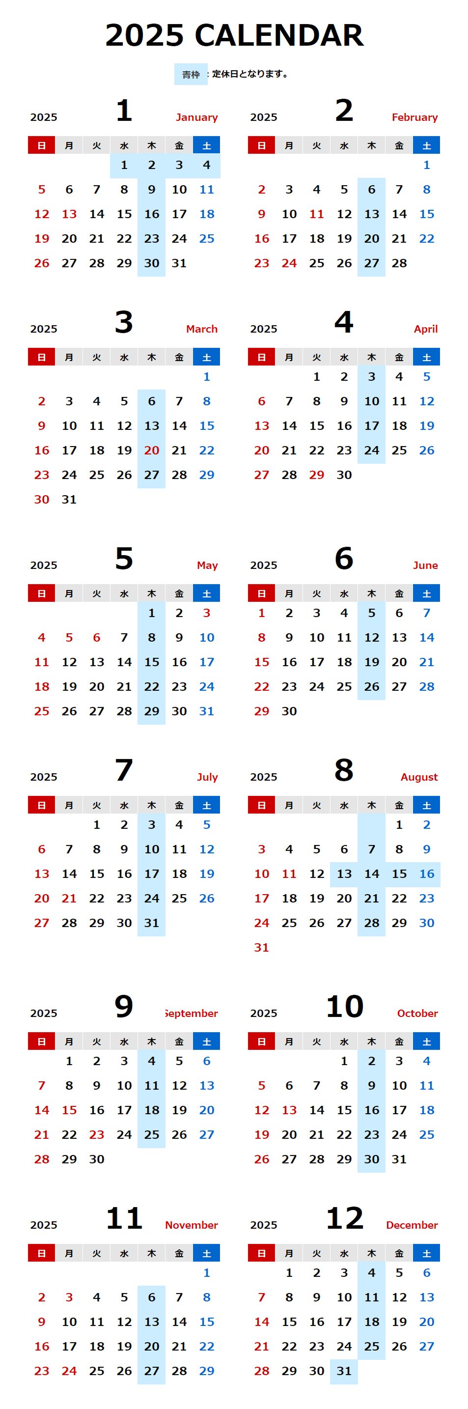 定休日カレンダー